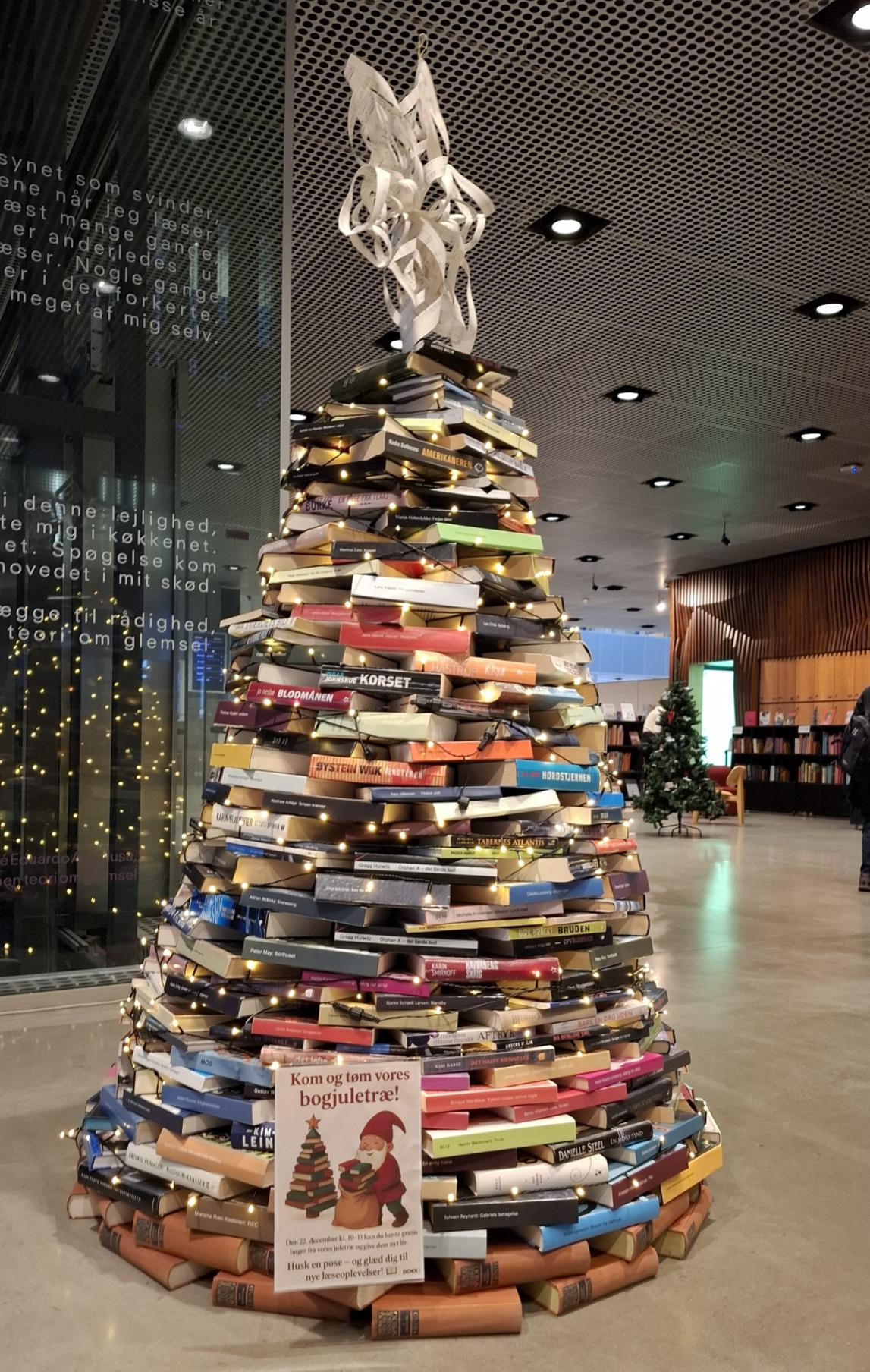 Christmas tree at Dokk1 Aarhus Main Library Denmark. A book tree about 2 metres tall made of about 60 ever-decreasing circles of used surplus library books, topped by a big star made of book pages. The titles are spine out. White fairy lights are wound all around it. At the foot of the tree, a framed sign - Santa beside a Christmas tree holding a pile of books and the message: 'Come and strip our book tree! Between 10 and 1 on December 22nd, you can pick free books from our Christmas tree and give them a new home. Bring a bag - and enjoy your new reads!'